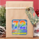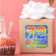 This fun, vibrant, and exciting birthday-themed sticker design features a cloudy blue sky pattern background, a large number "72" and "HAPPY BIRTHDAY," both having a multicolored rainbow spectrum inspired gradient pattern, and a personalised name. Fun and colourful stickers like this might be used when wrapping presents being given in celebration of somebody’s seventy second birthday. [~Z0000374]