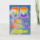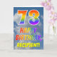 This fun and colourful 73rd birthday greeting card design features a depiction of a clouded blue sky, along with a large number "73" and the message "HAPPY BIRTHDAY," having a rainbow spectrum inspired gradient pattern colouring, on the front. The front also features a customisable recipient name. The inside features an editable birthday greeting message, or could perhaps be cleared and left blank if a message is to be written by hand instead. A customisable birthday card like this might be a fun way to acknowledge somebody’s seventy third birthday. [~Z0000371]