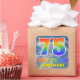 This eye-catching, fun, and vibrant birthday-themed sticker design features a cloudy blue sky pattern background, a large number "75" and "HAPPY BIRTHDAY," both having a multicolored rainbow spectrum inspired gradient pattern, and a customisable name. Colourful and fun stickers like this might be used when wrapping presents being given to somebody who is celebrating their 75th birthday. [~Z0000374]