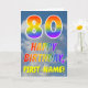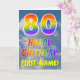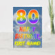 This fun and colorful 80th birthday greeting card design features a depiction of a cloudy blue sky, along with a large number "80" and the message "HAPPY BIRTHDAY," having a rainbow spectrum inspired gradient pattern coloring, on the front. The front also features the custom name of the card’s recipient. The inside features an editable birthday greeting message, or could perhaps be cleared and left blank if a message is to be written by hand instead. A personalized birthday card like this might be a fun way to send birthday wishes to somebody who is celebrating their eightieth birthday. [~Z0000371]