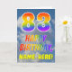 This fun and colourful 83rd birthday greeting card design features a representation of a blue sky with clouds, along with a large number "83" and the message "HAPPY BIRTHDAY," having a rainbow spectrum inspired gradient pattern colouring, on the front. The front also features the custom name of the card’s recipient. The inside features a customised birthday greeting message, or could perhaps be cleared and left blank if a message is to be written by hand instead. A personalised birthday card like this might be a fun way to acknowledge somebody’s eighty third birthday. [~Z0000371]