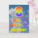 This fun and colourful 8th birthday greeting card design features a representation of a clouded blue sky, along with a large number "8" and the message "HAPPY BIRTHDAY," having a rainbow spectrum inspired gradient pattern colouring, on the front. The front also features the editable name of the card’s recipient. The inside features an editable birthday greeting message, or could perhaps be cleared and left blank if a message is to be written by hand instead. A birthday card like this might be a fun way to send birthday wishes to somebody who is celebrating their eighth birthday. [~Z0000371]