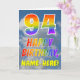 This fun and colourful 94th birthday greeting card design features a representation of a blue sky with clouds, along with a large number "94" and the message "HAPPY BIRTHDAY," having a rainbow spectrum inspired gradient pattern colouring, on the front. The front also features the personalised name of the card’s recipient. The inside features a personalised birthday greeting message, or could perhaps be cleared and left blank if a message is to be written by hand instead. A personalised birthday card like this might be a fun way to send birthday wishes to somebody who is celebrating their ninety fourth birthday. [~Z0000371]
