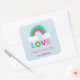 This fun, whimsical Valentine’s Day sticker is perfect for sealing cards and attaching to classroom exchange gifts. Featuring a whimsical rainbow with “Love” underneath. Pre-fill with your child’s name or delete the field to allow them to write in their own name. Shown in a light blue background