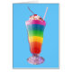 A kitchy, retro image of a milkshake with rainbow stripes.