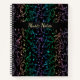 Rainbow Music Notes Personalised Spiral Notebook. Colourful musical notes and clefs pattern in blue green, purple, pink, and gold on black or your choice of background colour. Give your new notebook a name to make it yours. These notebooks also make a great gift for your favourite musician or music lover.