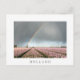Postcard of a rainbow and dark clouds during a spring storm over a landscape with an old windmill and pink hyacinth flowers in the dutch Bulb Region in the Netherlands with a white border and the text 'Holland'.