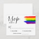 LGBT wedding RSVP with charming fonts, rainbow pride flag in paint brush strokes and a white background.