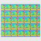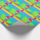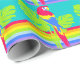 Bold colourful graphic wrapping paper featuring a repeat pattern of a simple graphic art tropical Scarlett macaw parrot bird on a rainbow striped background. Art and design by Sarah Trett.