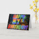 The front of this fun, exciting and eye-catching greeting card design features a colorful pattern inspired by celebratory fireworks, along with the message "HAPPY 57TH BIRTHDAY!" featuring a multicolored rainbow like gradient pattern, on a black colored background. The inside features a customized greeting message, or could perhaps be cleared and left blank if it is desired to write a message by hand instead. A greeting card like this might be a fun, happy way to acknowledge somebody’s fifty seventh birthday. [~Z0000355]