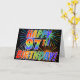 The front of this vibrant, fun and eye-catching greeting card design features a colourful celebratory fireworks inspired pattern, along with the message "HAPPY 97TH BIRTHDAY!" having a multicolored rainbow inspired gradient pattern, on a black coloured background. The inside features a customised greeting message, or could perhaps be cleared and left blank if a message is to be written by hand instead. A greeting card like this might be fun to send to somebody celebrating their ninety seventh birthday. [~Z0000355]