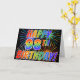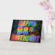 The front of this exciting, fun and eye-catching greeting card design features a colourful pattern inspired by celebratory fireworks, along with the message "HAPPY 98TH BIRTHDAY!" featuring a multicolored rainbow inspired gradient pattern, on a black coloured background. The inside features a custom greeting message, or could perhaps be cleared and left blank if a message is to be written by hand instead. A greeting card like this might be a fun, happy way to celebrate somebody’s 98th birthday. [~Z0000355]