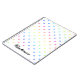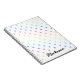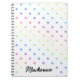 This cute custom notebook features a colourful design. Rainbow polka dots are printed across the front over a white background. A sample name is printed near the bottom which you can personalise to include your own custom name or text.