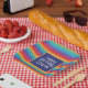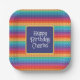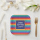 Colourful paper party plate features rainbow pop it pattern that looks like popular fidget / sensory toys and accessories. Customise with name or message in centre text square.