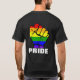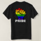Show your solidarity for the LGBTQ community with this rainbow fist design. On the front left, over the pocket area, there is a small version of the rainbow fist, with bold type underneath that reads "PRIDE". There is a larger version on the back of the shirt.
