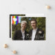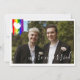 Charming lgbt wedding announcement card with rainbow pride flag drawn with messy strokes and adorned with a white heart and a white border. Double sided gay wedding announcement card personalised with your wedding photos. Gay elopement announcement with rainbow paint strokes and your photo. Pride themed elopement announcement personalised with photos.