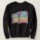 A colourful sketch depicts two stone hacienda arches. The bright hues suggest a sunny atmosphere, and through one arch, a serene landscape with trees is visible.
