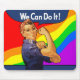 The retro classic WWII era Rosie the riveter "we can do it" image is a traditional icon for strong women. She is shown here against a wavy rainbow coloured background
