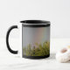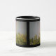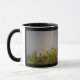 This coffee mug features a beautiful landscape photo of a rainbow over the top of some trees. The photograph was taken immediately after a rainstorm to capture the vivid colours of the rainbow. The surrounding sky is grey with cloud cover. The photo is on both sides of the mug. The design is shown on a black and white ringer style mug, but is also available on a range of other colours and styles of mugs.