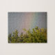This awesome puzzle features a beautiful landscape photo of a rainbow over the top of some trees. The photograph was taken immediately after a rainstorm to capture the vivid colours of the rainbow. The surrounding sky is grey with cloud cover.