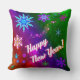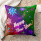 20” x 20” throw pillow with an image of pretty blue, fuchsia and green snowflakes on a rainbow background of holiday lights. White holiday sentiment. Purple back. See the entire New Year Pillow collection under the HOME category in the HOLIDAYS section.