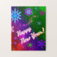Give friends and family a unique New Year greeting with this 11” x 14” jigsaw puzzle with an image of pretty blue, fuchsia and green snowflakes on a rainbow background of holiday lights. White holiday sentiment. See the entire New Year Puzzle collection under the HOME category in the HOLIDAYS section.