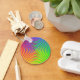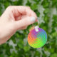 Here is a colourful keychain with an abstract spiral rainbow pattern swirling around a central target in colours of green, blue, yellow, orange and red.