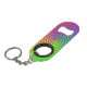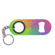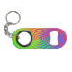 Here is a colourful mini bottle opener with keychain featuring an abstract spiral rainbow pattern swirling around a central target in colours of green, blue, yellow, orange and red. Could be used in the context of LGBT.