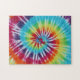 Photo of fabric dyed a bright, colourful rainbow spiral tie dye pattern.