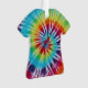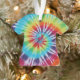 Photo of fabric dyed a bright, colorful rainbow spiral tie dye pattern on a tee shaped acrylic ornament.