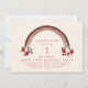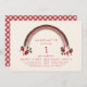 Berry first birthday theme featuring illustration of pink and red rainbow with strawberries, flowers, and leaves. Reverse is red gingham. Text is red.