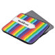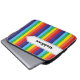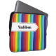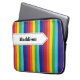 This bright rainbow striped pattern laptop sleeve has a white banner ribbon with black stitching detail across the top. It is personalized with a name or whatever text you want to add.
