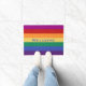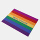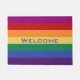 Rainbow colour stripes of red, purple, violet, blue, orange, yellow, and green, on a subtle abstract patterned background.