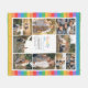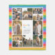Rainbow stripes blanket printed with a photo collage of ten photos surrounding a white field where family is written in the colors of the rainbow along with the definition of the word, which you can customize.