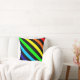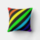 The pillow front has diagonal rainbow and black stripes and the back is the same pattern flipped.