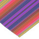 This table runner is decorated with an abstract striped pattern in orange, purple, yellow, red, green, violet and black which resembles a beautiful rainbow spectrum.