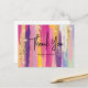 Thank you postcard with an abstract background design. Vibrant stripes in both bold and pastel colours. Pinks, blues, purples and yellow colours combined with faux gold sparkly glitter layered over top.