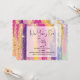 New Year's Eve party invitation with an abstract background design. Vibrant stripes in both bold and pastel colours. Pinks, blues, purples and yellow colours combined with faux gold sparkly glitter layered over top.
