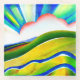 Digital watercolor landscape design in vibrant rainbow colours and textures with a sunrise and protruding sunrays.