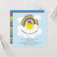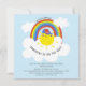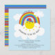 A Little ray of sunshine baby shower invitation featuring the cutest smiling sun with a bright coloured rainbow for a Boys baby shower. Flip our invite over to view a striped rainbow back for an extra special touch
