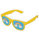 Cute summer sunglasses with a pink rainbow against blue sky. Available in cheery summery yellow and other bright colours for your pool party. Image by www.prettygrafik.com