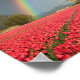 Poster print of a colourful rainbow in a dark sky over a windmill and a field full of bright red tulips during a spring storm in a landscape near Amsterdam in the Netherlands.