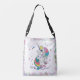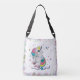A cute unicorn bag featuring a little rainbow unicorn, sitting among colourful stars on a white background. There is a border around the edge made of rainbow-coloured glitter (please note, printed only). For a bit of variety, the unicorn is facing the opposite way on the back. This cute crossbody bag would make a perfect gift for any unicorn lover out there, or even for yourself!