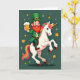 Designed with a festive, storybook look, the card shows a smiling leprechaun riding a rearing white unicorn at the center of the scene. He wears emerald green clothes and a tall green hat, his orange beard framing a grin as he lifts a frothy pint like a toast shared with a close friend 💚. The unicorn’s bright blue eyes and golden spiral horn catch the light, while its rainbow mane and tail sweep upward in flowing strands 🌈. Behind them, a deep teal-green backdrop is sprinkled with small golden shamrocks and soft, pale green stars, like confetti floating in night air. The leprechaun leans forward with an easy confidence, and the unicorn’s lifted front legs add a lively, celebratory energy to their partnership. A St. Patrick’s Day greeting sits near the top in light gold lettering, with smaller words tucked beneath in pale green for contrast. Golden shamrocks dot the corners, and the rainbow mane arcs across the right side while the unicorn’s tail curls along the lower edge.