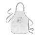 A cute child's apron features a white unicorn with a rainbow tail, pink hearts and blue flowers. Personalise with name for a special gift.