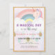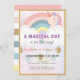 This cute and magical " a magical day is on the way " girl's birthday invitation features a rainbow coloured background with a unicorn, rainbow, coluds, and faux gold raindrops. The reverse side features a white background with rainbow coloured stripes. Personalise for your needs. You can find more matching products at my store.