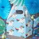 Party favour box shown in a light blue colour with a cute cartoon rainbow unicorn print.
