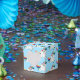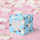Party favour box shown in a light blue colour with a cute cartoon rainbow unicorn print.