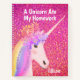 Keep up with your school work or notes in this Rainbow Unicorn Pink Glitter Glam Personalised Notebook. The front is designed with a white pretty unicorn. She has pastel rainbow hair and flowers on top of her head. The background is bright pink faux glitter and funny quote is, "a unicorn ate my homework" in bold white block lettering across the top. Name is in script lettering on right lower front. Click personalise template option and following the prompt.