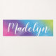 Modern vibrant coloured custom yoga exercise mat design features a diagonal rainbow watercolor gradient / tie dye style background with modern white script overlay text that can be personalised with your name or other wording. Colours include hot pink, violet purple, cyan blue, and lime green.